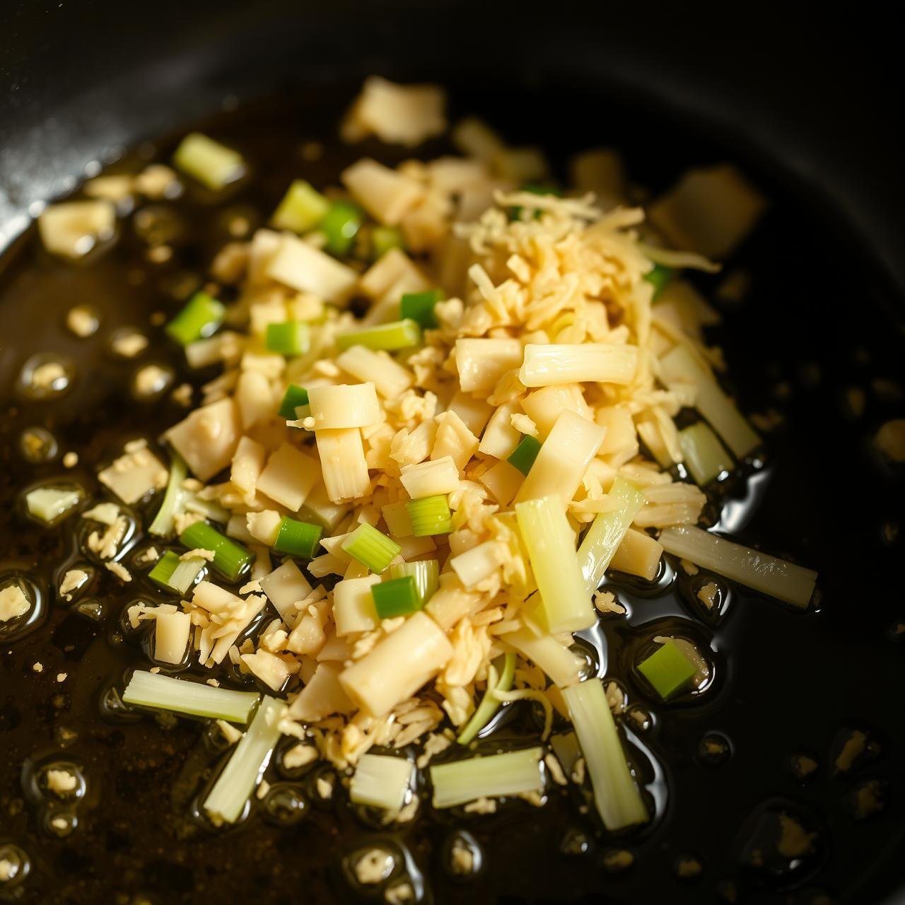 The flavor journey begins here, with the holy trinity of many Asian cuisines. This step awakens the foundational flavors that will permeate the entire dish.