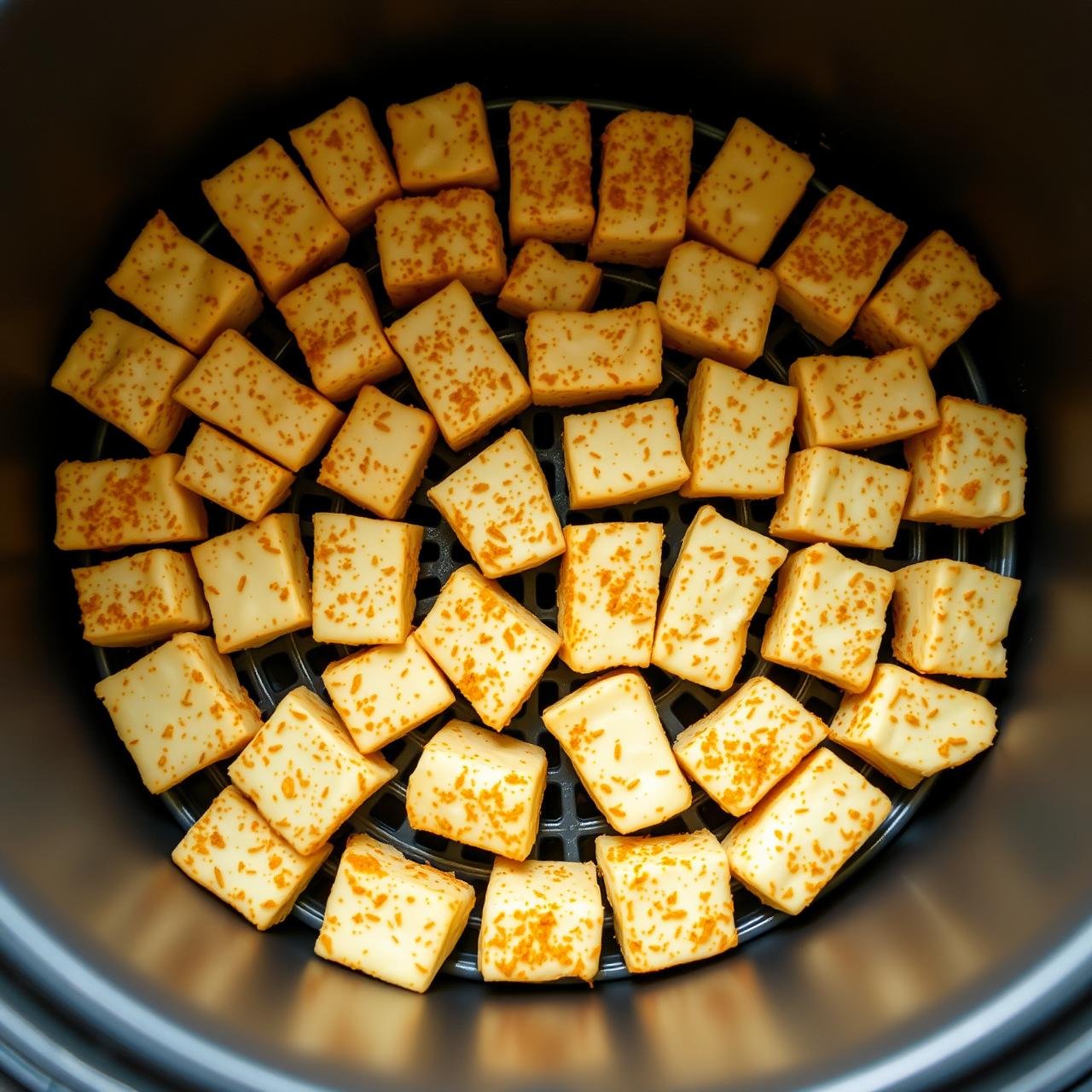 5. Arrange in the Air Fryer: Place the coated tofu cubes in the air fryer basket in a single, even layer. Do not overcrowd the basket! The nuggets need space for the hot air to circulate around them. If necessary, cook in two batches. Overcrowding will cause the tofu to steam instead of crisp.