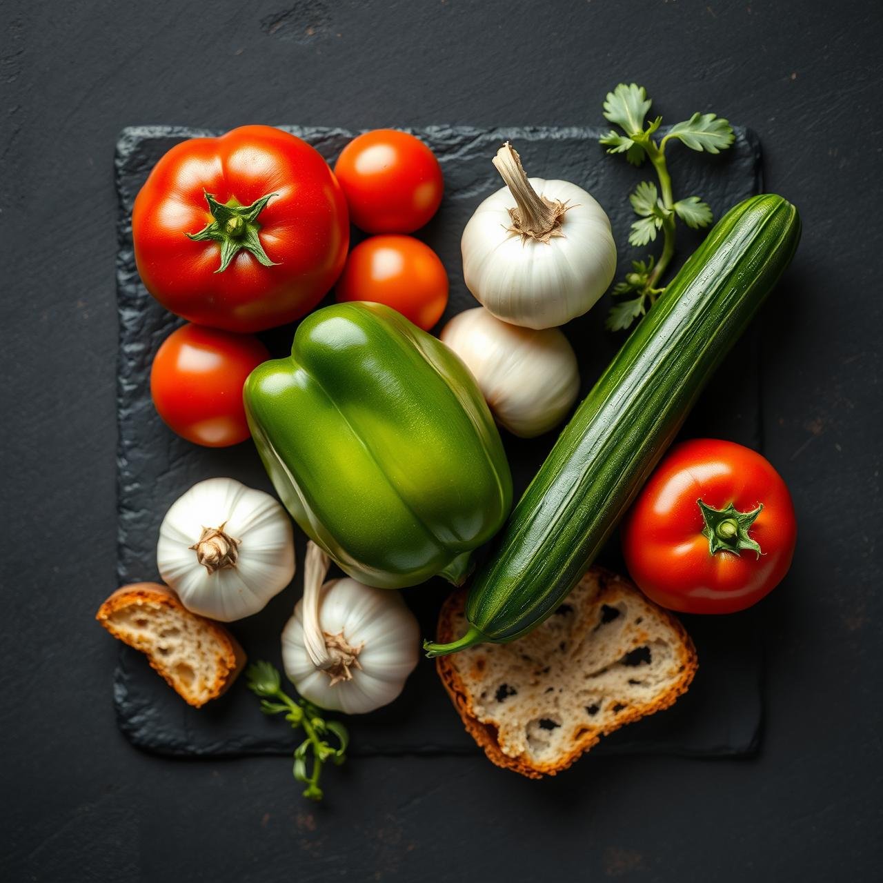- Stale Bread: About 3 oz (85g) of a good quality, crusty white bread, like a ciabatta or baguette, with crusts removed. Soaking it in water and then squeezing it out helps to thicken the Gazpacho and create a beautiful, creamy emulsion. This is a traditional and essential step.