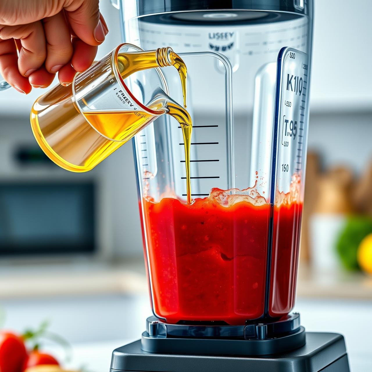 This is the most critical step for achieving a creamy texture. With the blender running on a medium-low speed, slowly drizzle in the 1/2 cup of extra virgin olive oil. You will see the color lighten and the texture become thicker and creamier as the oil emulsifies into the vegetable base. Once all the oil is incorporated, pour in the 3 tablespoons of sherry vinegar and blend for another 10 seconds to combine.