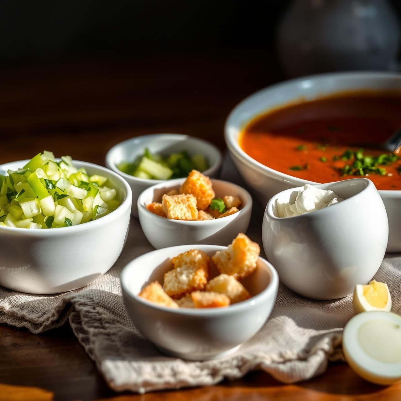 A bowl of Gazpacho is a canvas, and the garnishes are the final brushstrokes. They add texture, flavor, and visual appeal. Traditionally, the soup is served with small bowls of finely diced toppings so guests can add their own. This ‘deconstructed’ element of the soup is part of the experience.