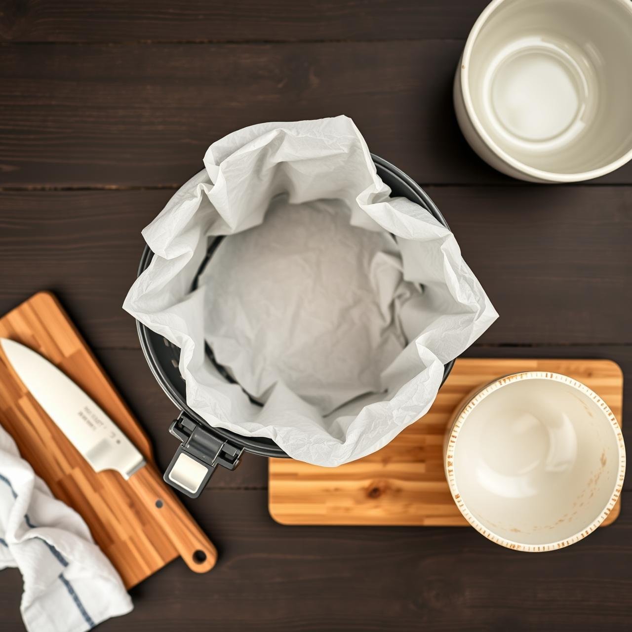 - Set Up Your Workstation: Fill your shallow dish with about an inch of warm water. Lay a clean, damp tea towel or your cutting board next to it. This will be your folding surface. Have your bowl of filling and your air fryer basket lined with parchment paper ready.