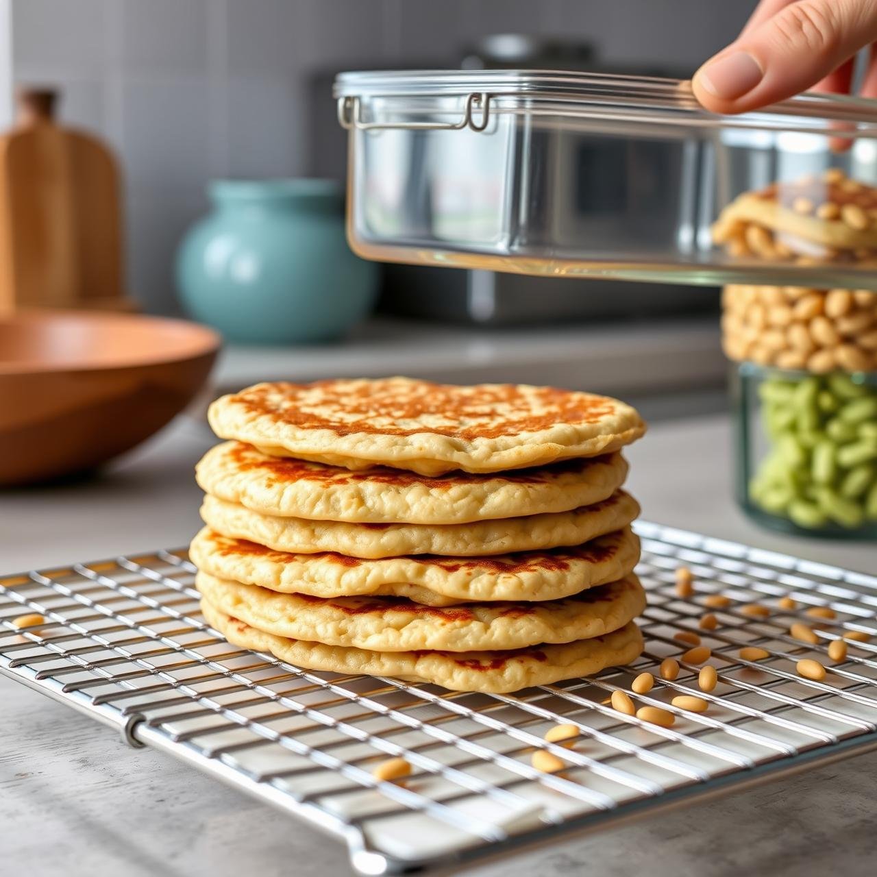Allow the pancakes to cool completely on a wire rack. Once cool, stack them with a small piece of parchment paper between each layer to prevent sticking. Store them in an airtight container in the refrigerator for up to 3 days.