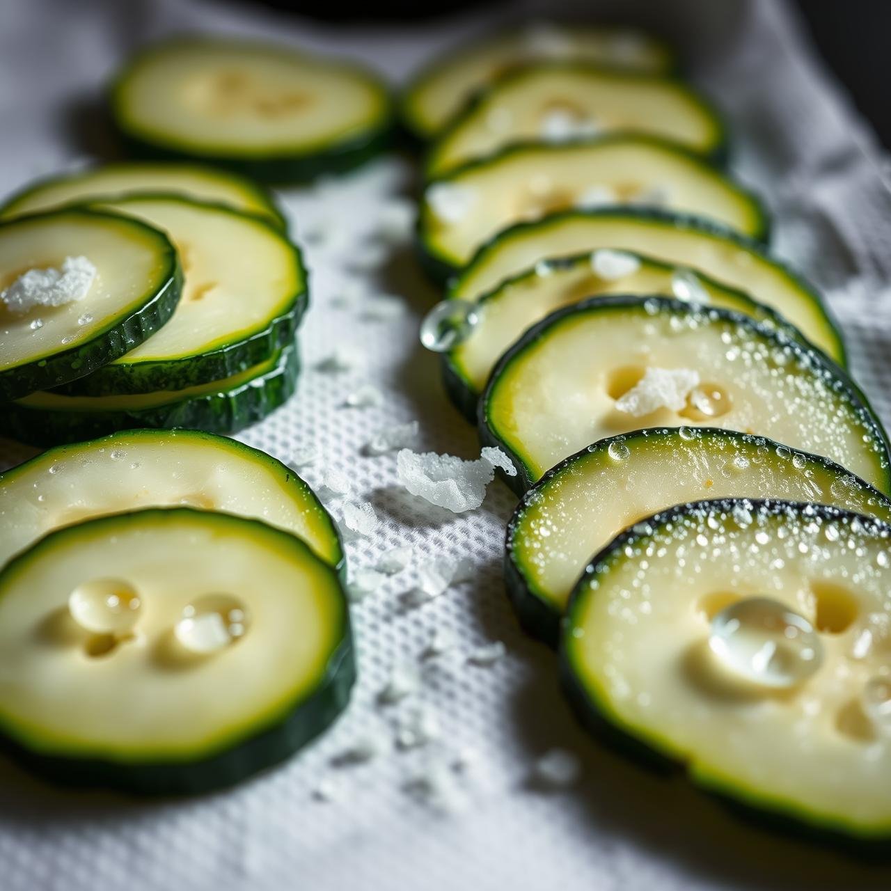 - The Crucial ‘Sweating’ Step: Arrange the zucchini slices in a single layer on paper towels or a clean kitchen towel. Sprinkle them evenly with about 1/2 teaspoon of fine sea salt. Let them sit for 20-30 minutes. You will see beads of water forming on the surface. This is exactly what we want!