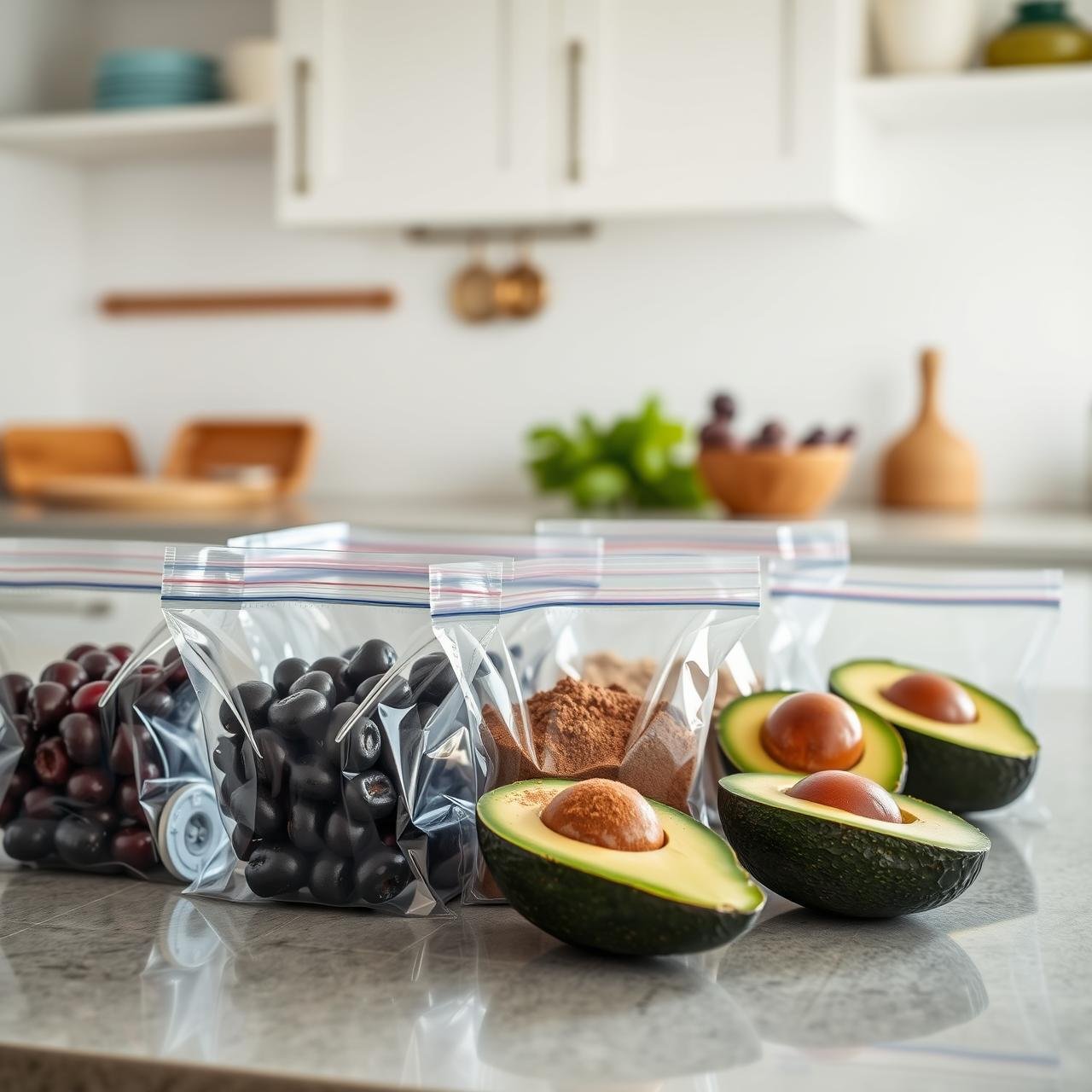 • In a freezer-safe bag or container, combine the 2 cups of frozen cherries, 3 tablespoons of cacao powder, and 1 tablespoon of chia seeds.