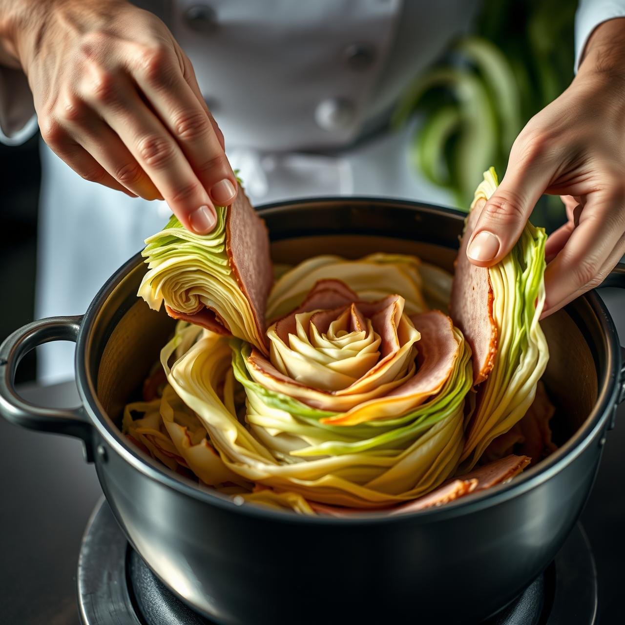4. Arrange in the Pot: This is the most crucial step for the visual ‘wow’ factor. Begin placing the cut sections into your pot, cut-side up. Start from the outer edge and work your way in, packing them in tightly against each other to form a spiral or flower pattern. The tight packing is key—it helps the layers hold their shape during cooking. Continue until the pot is snugly filled.