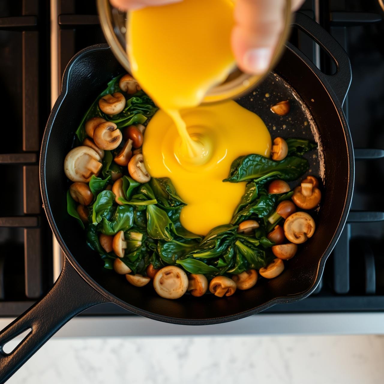 6. Combine and Cook: Pour the whisked egg mixture evenly over the cooked vegetables in the skillet. Use a spatula to gently distribute the vegetables if needed. Allow the frittata to cook on the stovetop over medium heat, undisturbed, for 2-3 minutes. You will see the edges begin to set.