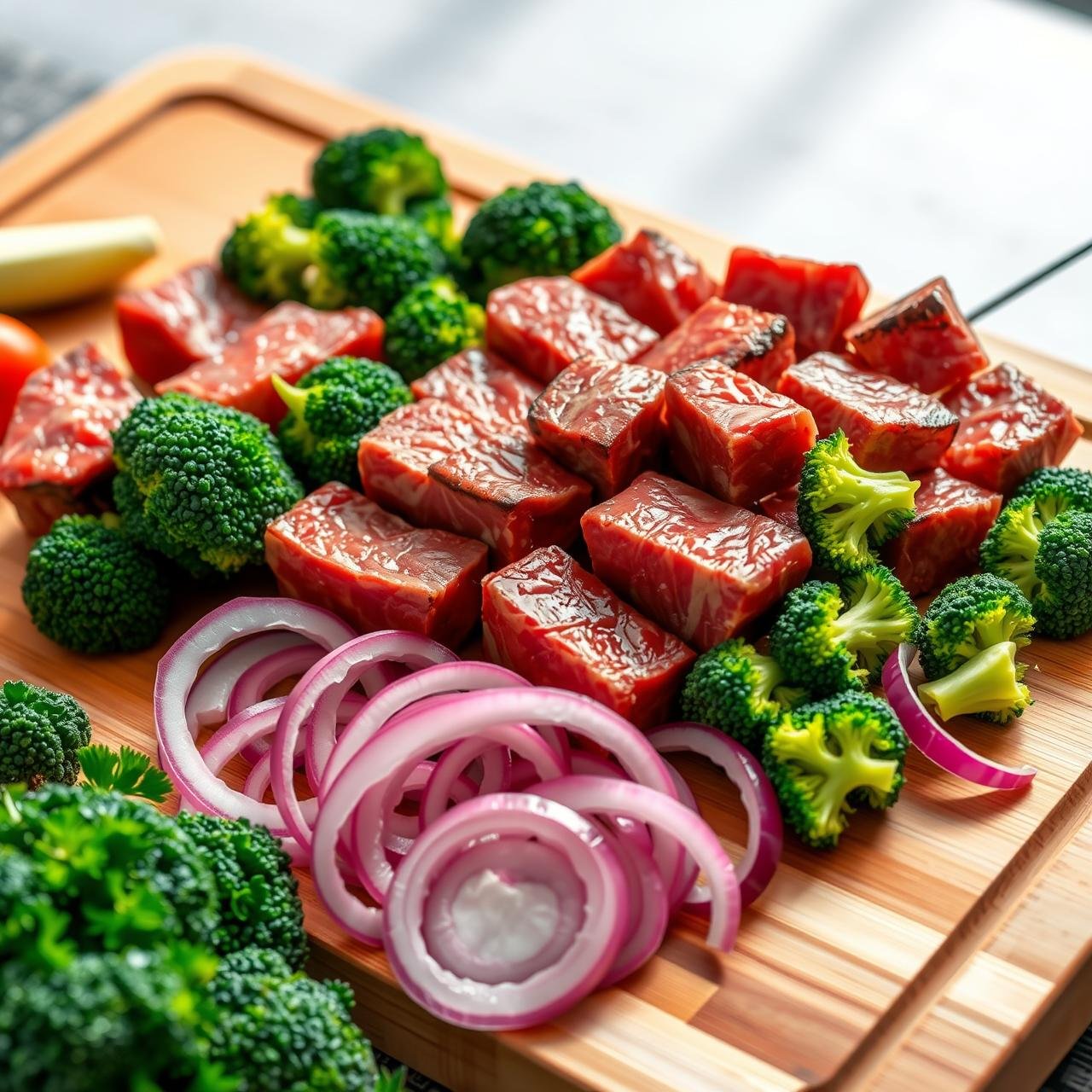 About 30 minutes before you plan to grill, remove the beef from the fridge to allow it to come to room temperature. If using wooden skewers, place them in a shallow dish of water to soak. In a separate bowl, toss the broccoli florets and red onion wedges with 1 tablespoon of olive oil and a light seasoning of salt and pepper.