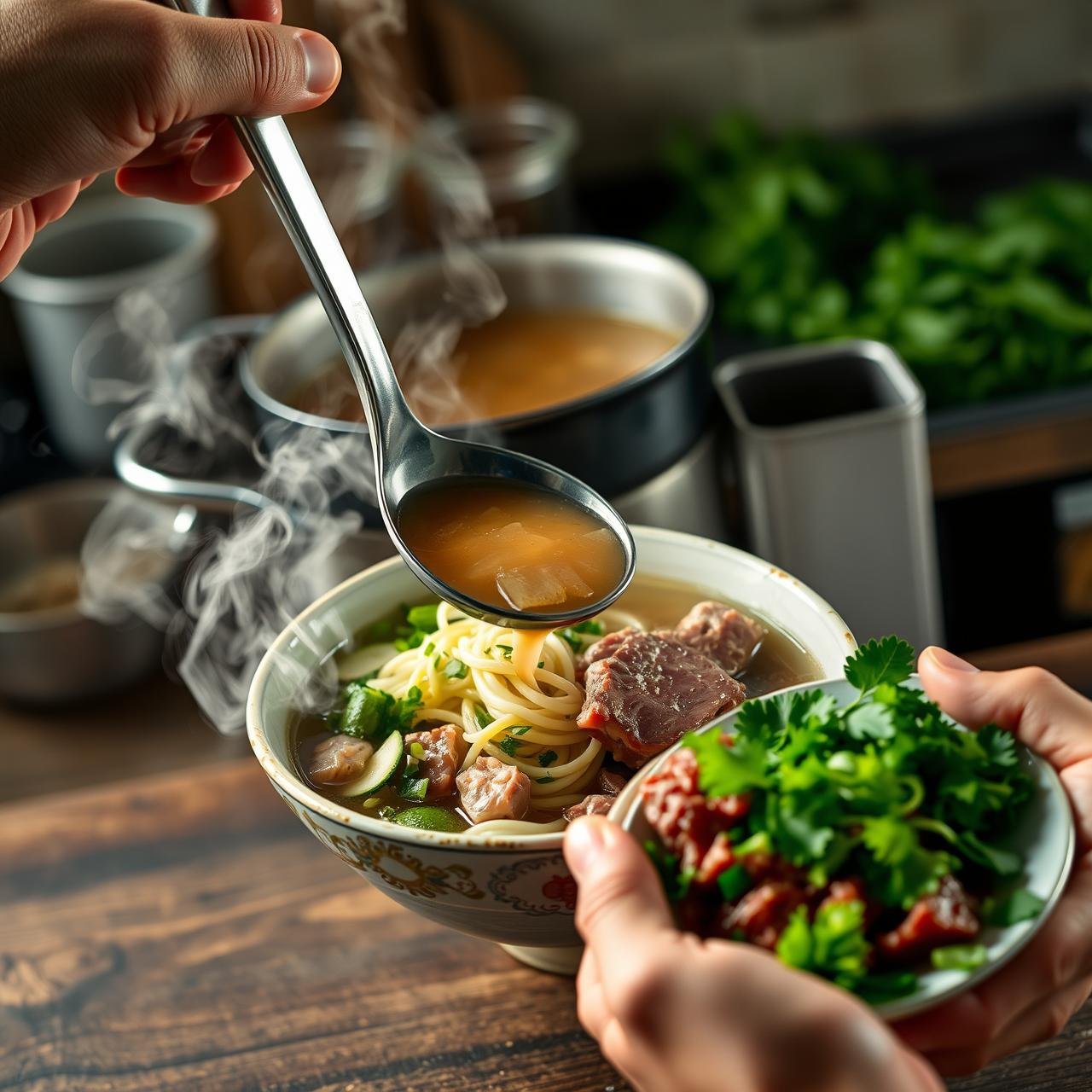 - Ladle the Broth: Bring your finished bone broth to a rolling boil. It must be piping hot to cook the beef and warm the noodles. Immediately ladle the boiling broth into the bowl, pouring it over the beef slices. You will see the beef instantly change color from pink to brown as it cooks.