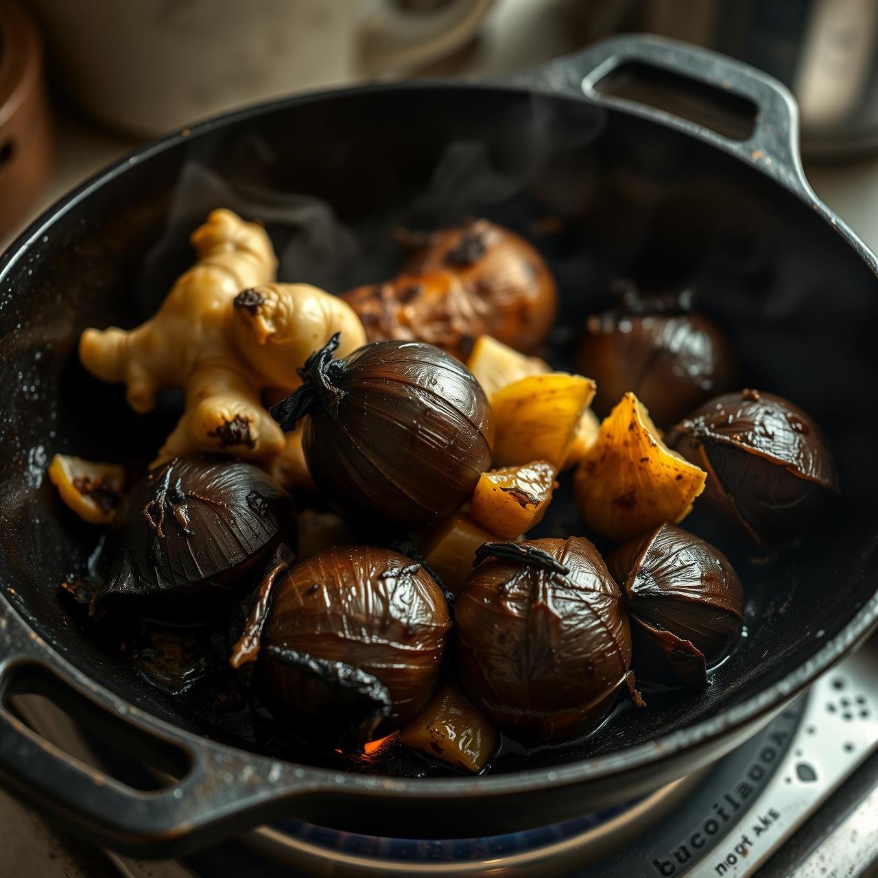 - Char the Aromatics: While the bones roast, place the halved onions and ginger, cut-side down, in a dry cast-iron skillet over high heat. Char them until they are blackened in spots, about 5-7 minutes per side. This removes their raw taste and adds a smoky sweetness.