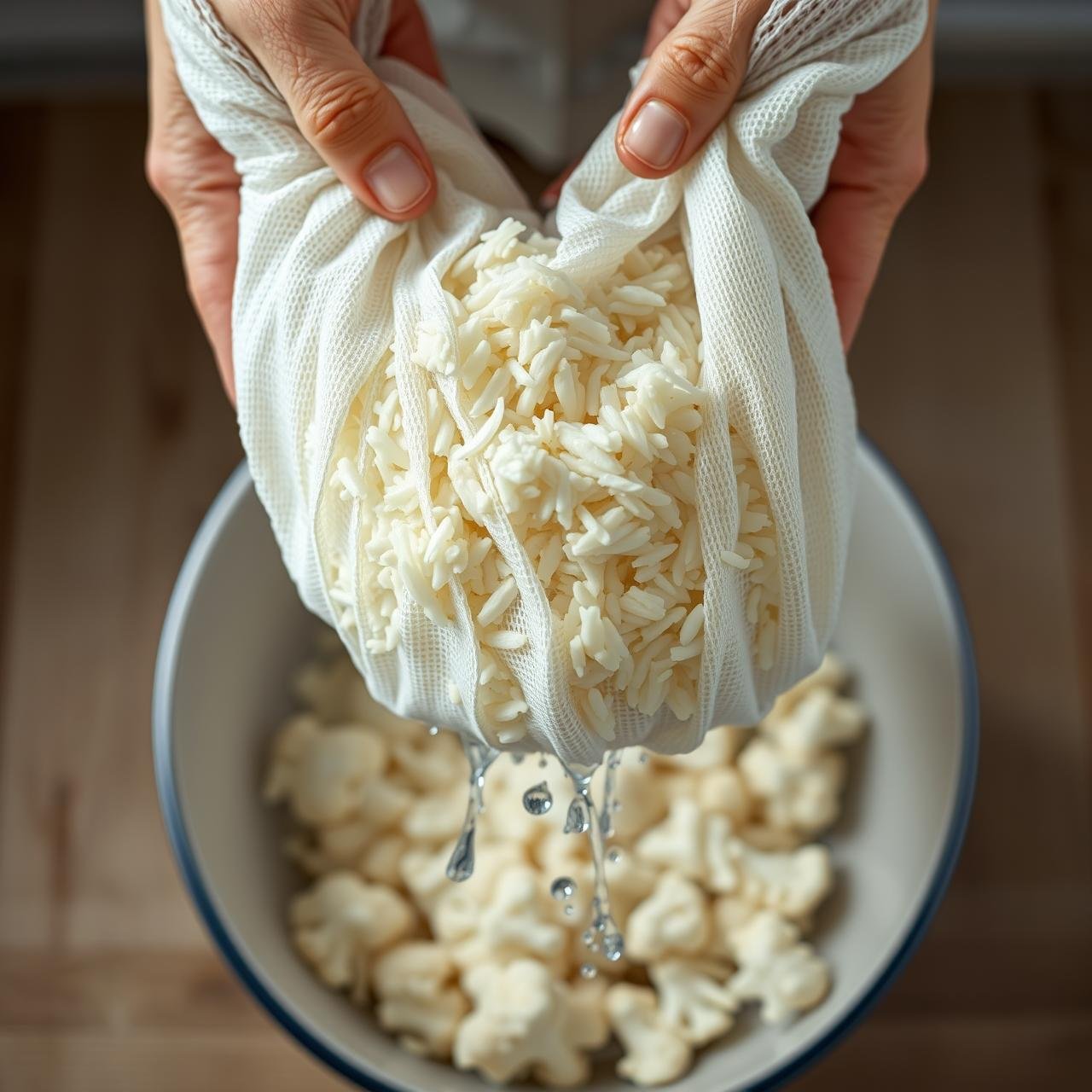 This is where the magic happens. Transfer the cooled cauliflower to the center of a large piece of cheesecloth or a nut milk bag. Gather the edges to form a tight bundle. Over a bowl or the sink, begin to twist and squeeze with all your might. You will be astonished at how much water comes out. Continue wringing until you can barely get another drop out. The resulting cauliflower pulp should be dry and crumbly. You should be able to extract at least 1 cup of water.