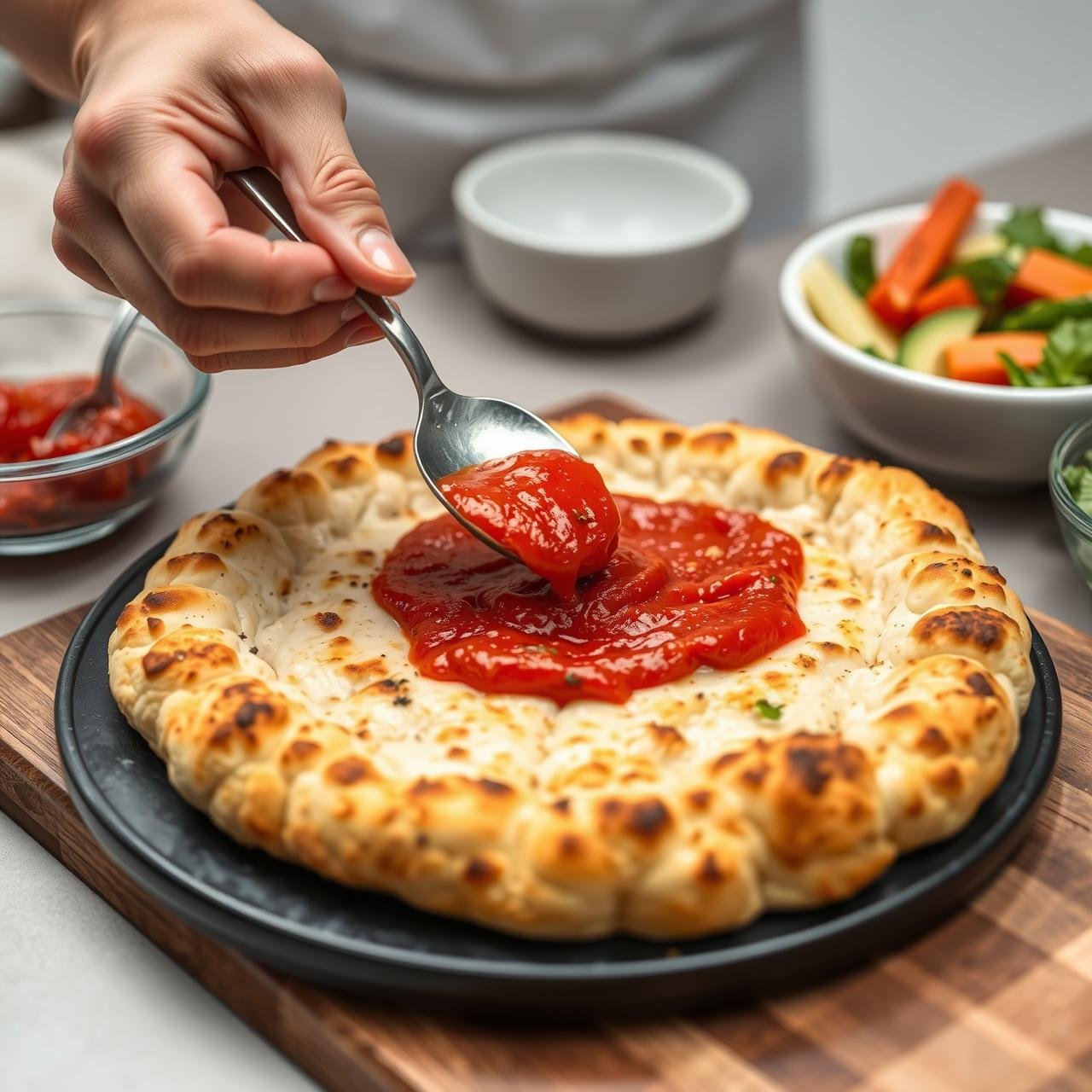 Remove the crust from the oven. Let it cool for a minute. Spread a thin, even layer of your favorite pizza sauce over the surface, leaving a small border around the edge. Use no more than 1/3 cup of sauce. Too much sauce will reintroduce moisture and compromise the crust’s integrity.