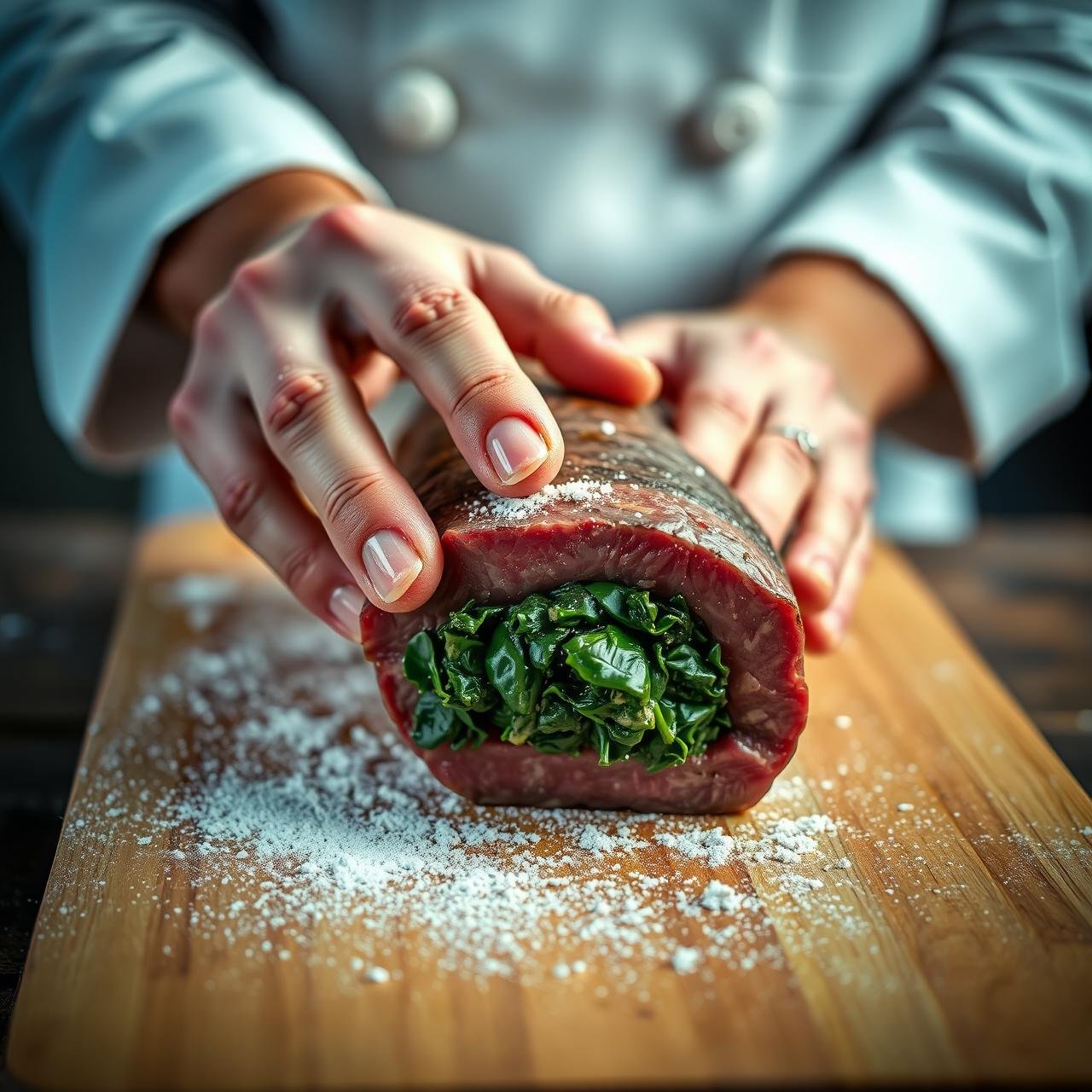Spread the spinach and cheese filling evenly over the surface of the pounded steak, leaving a 1-inch border along one of the long edges. Starting from the opposite long edge, tightly roll the steak into a log. The border you left clean will help seal the roll. Have several pieces of butcher’s twine ready. Tie the steak log securely at 1.5 to 2-inch intervals to ensure it holds its shape during cooking.