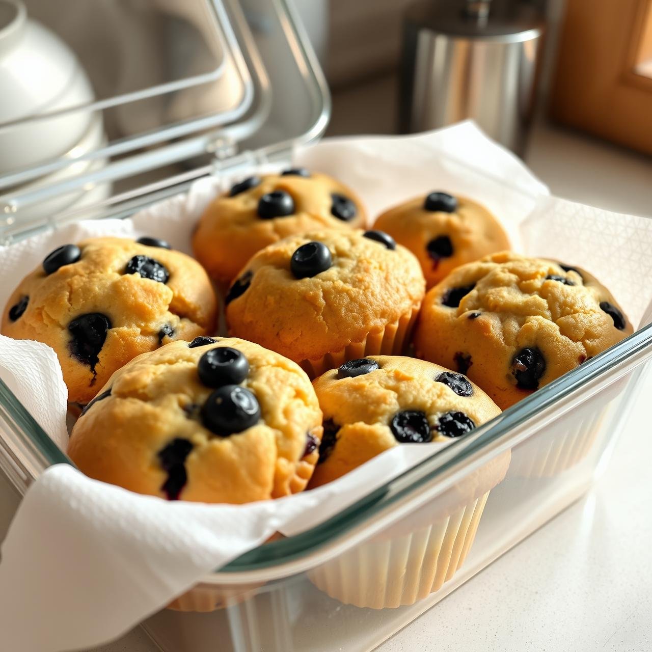 For short-term storage (up to 2 days), the best method is to line an airtight container with a paper towel. Place the muffins in a single layer on the paper towel, then lay another paper towel on top before sealing the container. The paper towel absorbs excess moisture, preventing the muffin tops from becoming sticky.
