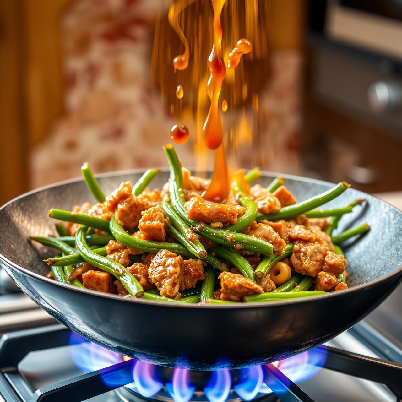 - Bring It All Together: Return the blistered green beans to the wok with the pork and aromatics. Pour the prepared ‘Finishing Sauce’ over everything. Toss vigorously for 1-2 minutes to coat every bean evenly and allow the sauce to reduce slightly, clinging to the ingredients. The dish should be glossy and aromatic.