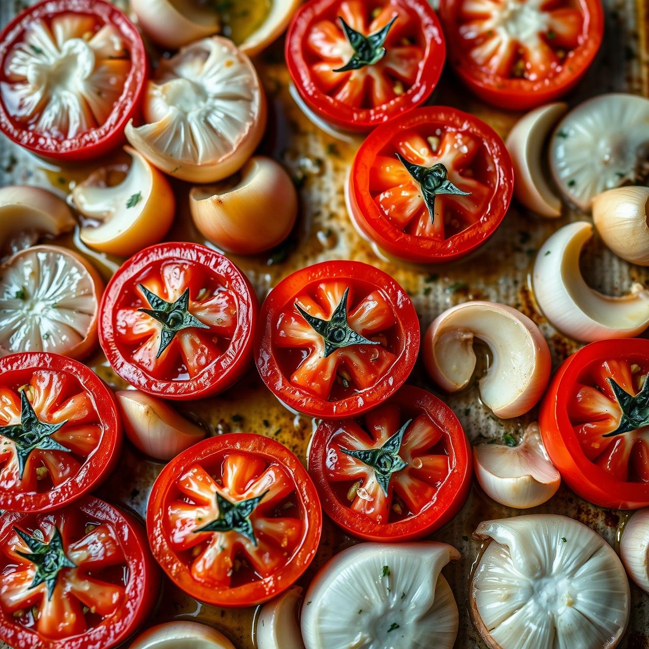 - Preheat and Prep: Preheat your oven to 400°F (200°C). Halve the tomatoes lengthwise and arrange them, cut-side up, on the rimmed baking sheet along with the onion wedges and unpeeled garlic cloves.