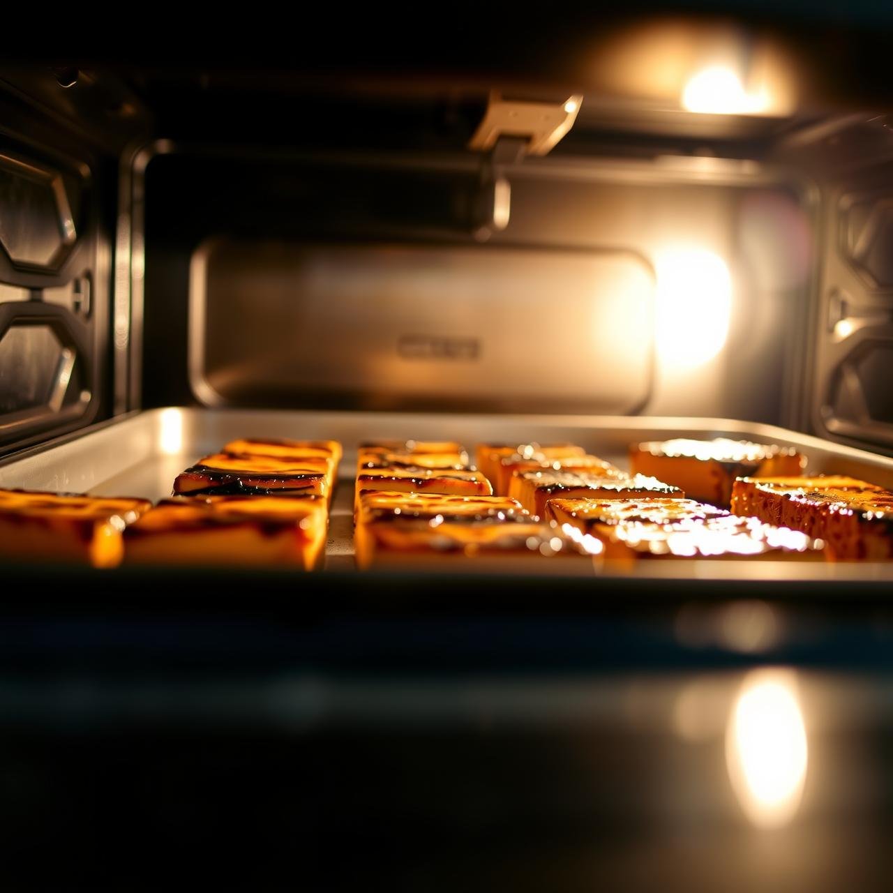 Now that our components are ready, it’s time for the oven to work its magic. We use a two-stage baking process: first, a preliminary bake to dry out the surface of the tofu, and second, baking with the glaze to create that sticky, caramelized crust.