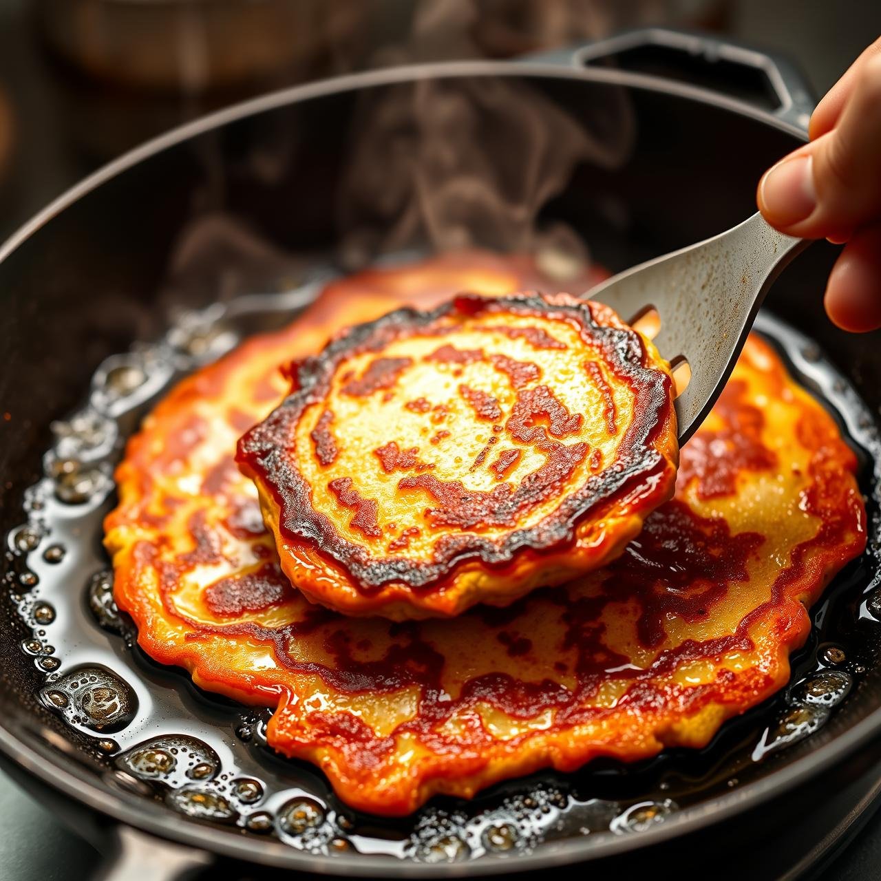 - Fry to Golden Brown: Let the pancake cook undisturbed for 3-4 minutes. You’ll see the edges start to look dry and golden brown. The underside should be deeply browned and crisp. Use a thin spatula to peek.