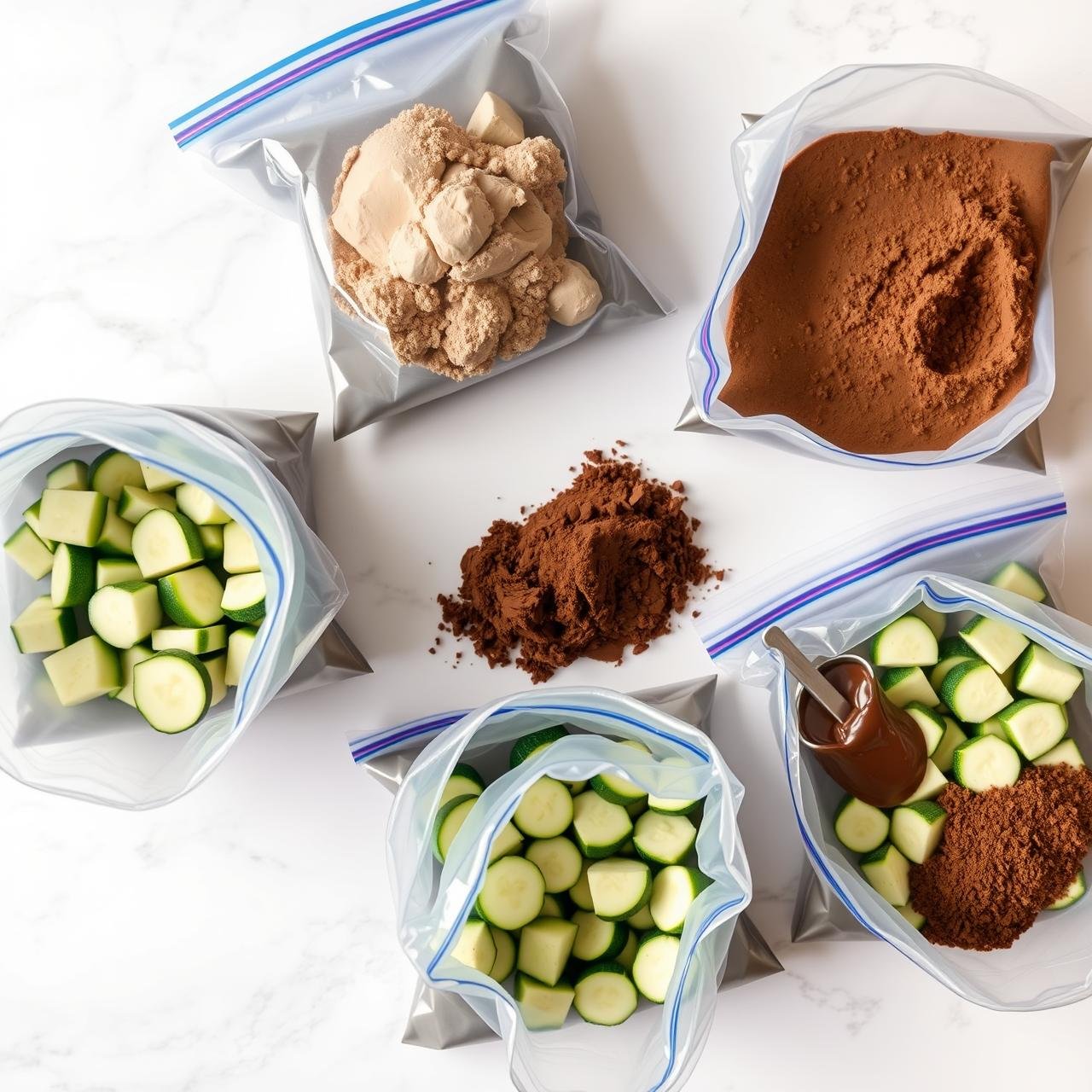 - To each bag, add the pre-portioned, non-liquid ingredients: 1 cup of frozen zucchini chunks, 1 scoop of protein powder, 2-3 tablespoons of cacao powder, your sweetener, and the pinch of salt.