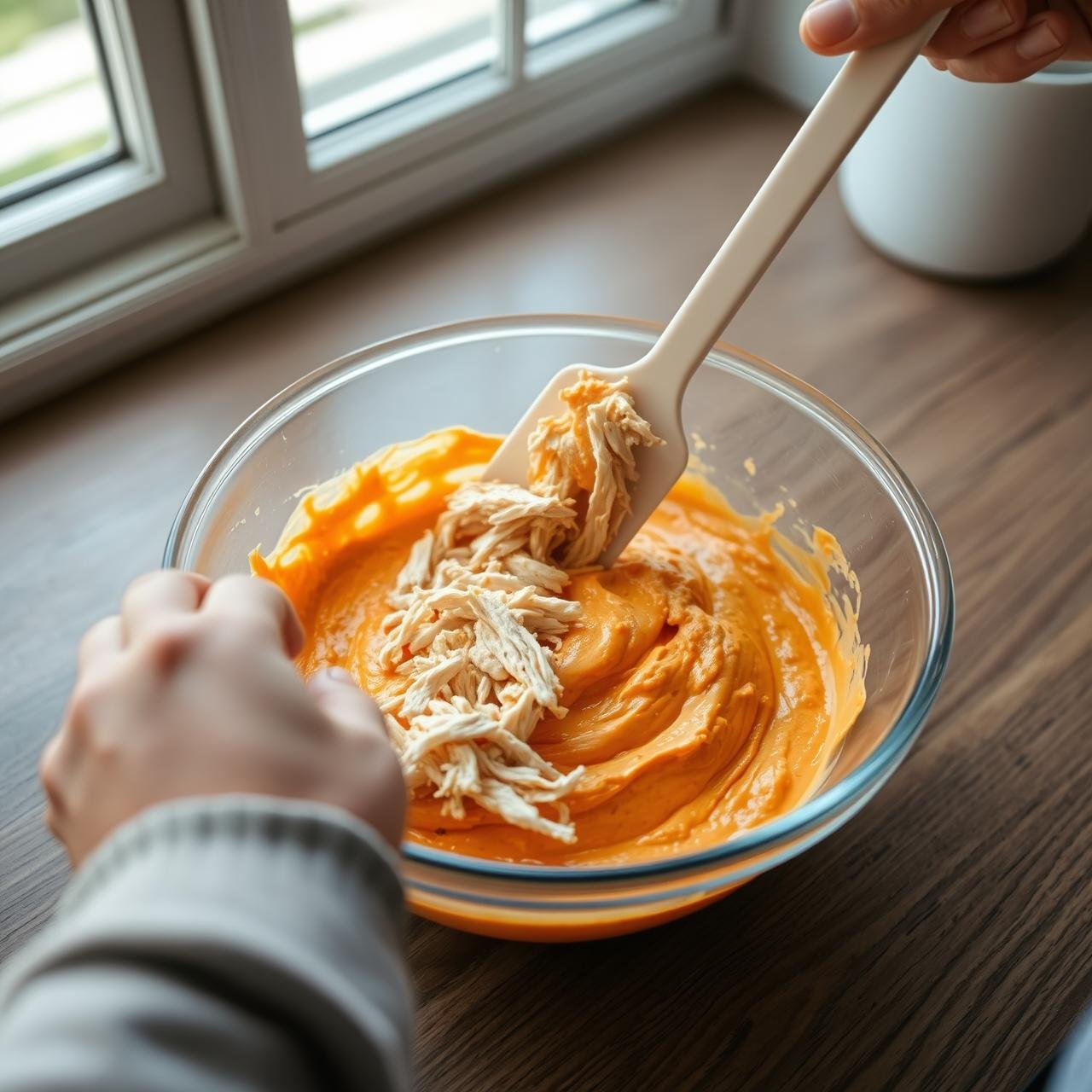 - Add the Core Components: Gently fold in the shredded chicken and 1/2 cup of the mozzarella cheese. Continue to mix until every piece of chicken is generously coated in the creamy buffalo sauce.