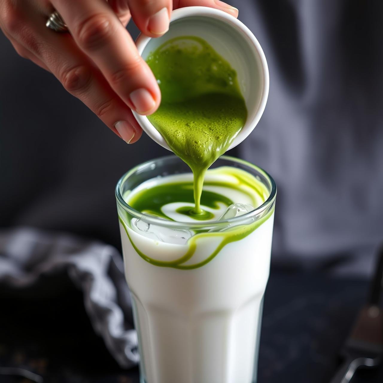 Slowly pour the prepared matcha concentrate over the milk and ice. Watch as the vibrant green cascades through the creamy white, creating a beautiful, mesmerizing swirl. Give it a gentle stir to combine, or enjoy the layered look before you take your first sip. Enjoy immediately!