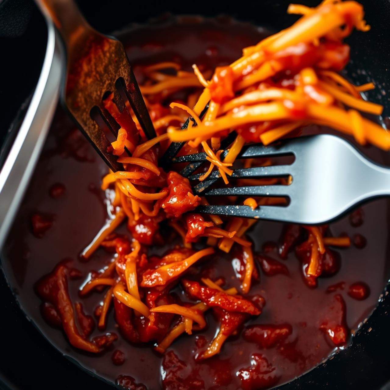 After simmering, the jackfruit should be very soft. Remove the lid. Using two forks, pull and press the jackfruit pieces apart directly in the pan until you achieve your desired shredded consistency. Continue to cook, uncovered, for another 5-10 minutes, stirring occasionally. This allows any excess liquid to evaporate and the sauce to thicken and caramelize slightly on the jackfruit. Season with salt and pepper to taste.