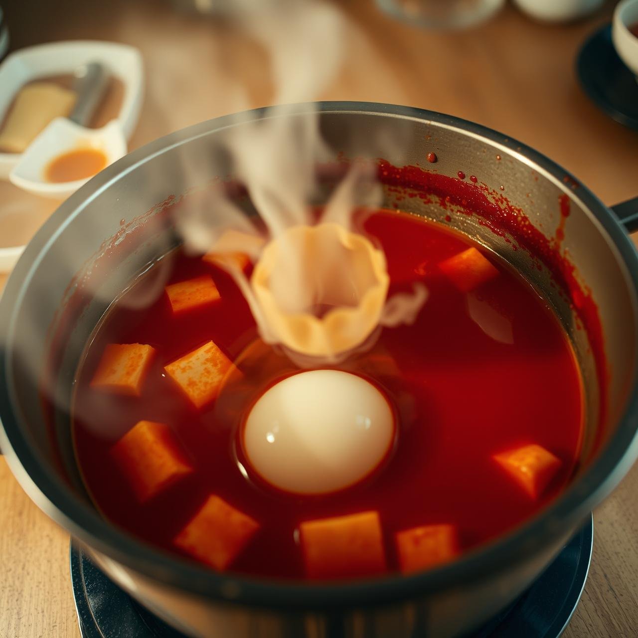 Taste the broth and adjust seasoning if needed—more soy sauce for saltiness, a pinch of sugar if it’s too sour. Turn off the heat. The stew should be volcanically hot. Immediately crack the 1 large egg directly into the center of the stew. Do not stir. The residual heat will gently cook the egg white while leaving the yolk luxuriously runny.