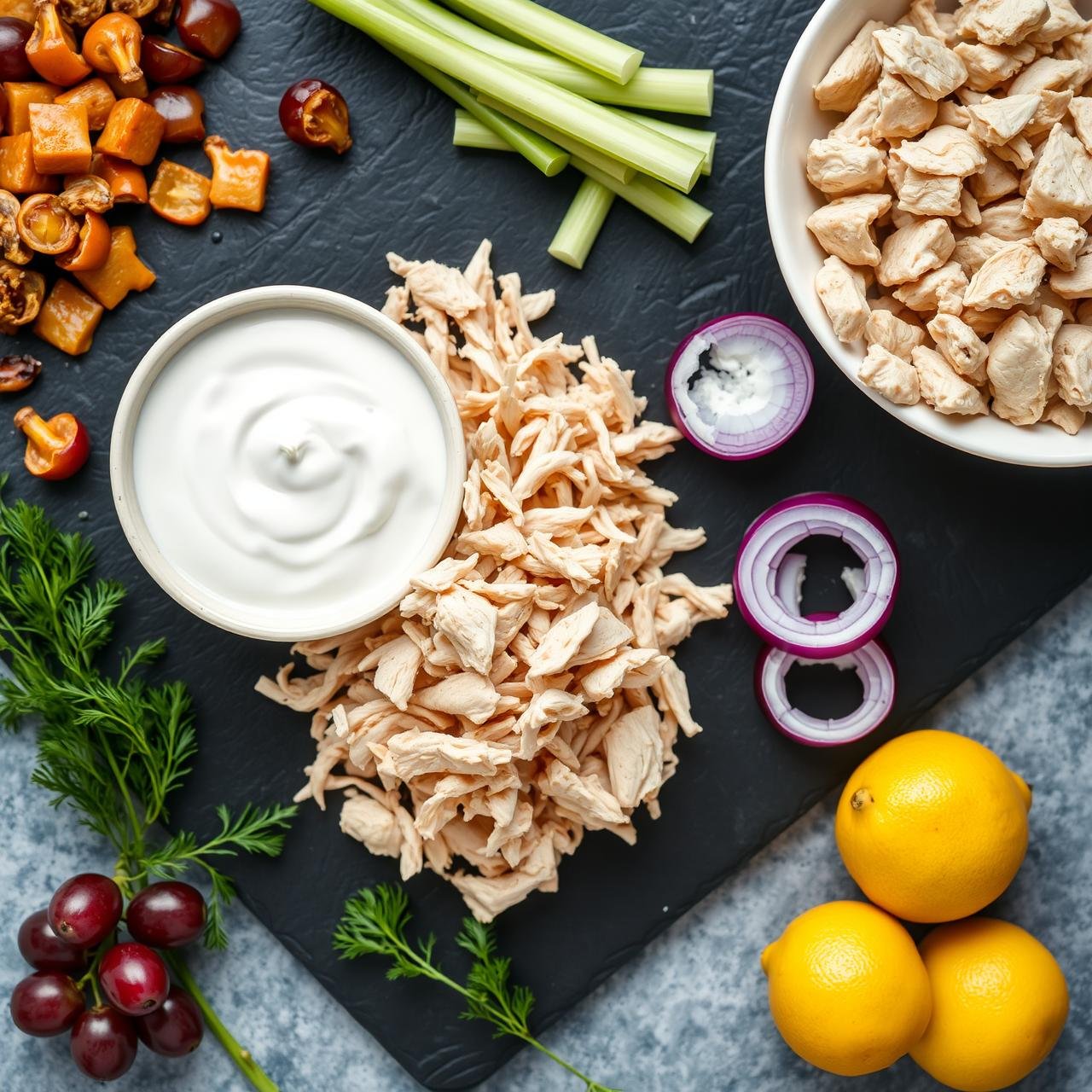 - Chop the Veggies & Add-ins: Prepare your textural elements. Finely dice the celery and red onion. This ensures you get a little bit of their flavor and crunch in every bite without overwhelming the chicken. If you’re using them, halve your grapes and roughly chop your toasted nuts. Add the celery, onion, grapes, and nuts to the bowl with the chicken.