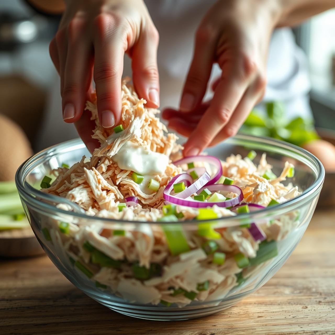 - Gently Fold it All Together: Pour the prepared Greek yogurt dressing over the chicken and vegetable mixture in the large bowl. Using a spatula, gently fold everything together until the chicken and veggies are evenly coated in the creamy dressing. Be careful not to overmix, as you want to maintain the texture of the shredded chicken.