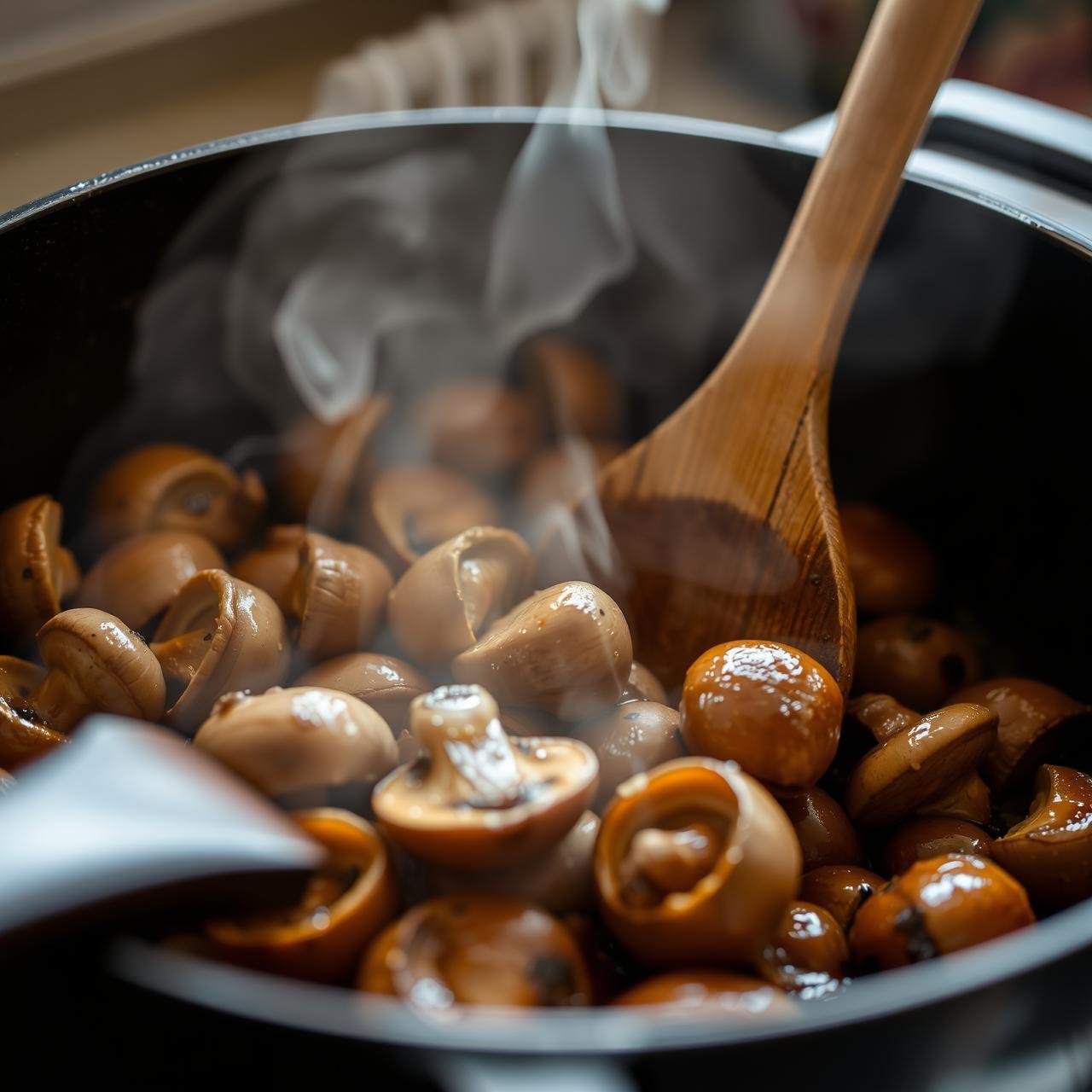 Pour in the dry sherry to deglaze the pot, scraping up any browned bits from the bottom with your wooden spoon. Let the sherry bubble and reduce by about half. Return the cooked mushrooms to the pot, and pour in the chicken or vegetable broth. Bring the mixture to a simmer, then reduce the heat to low, cover, and let it gently simmer for 15-20 minutes to allow the flavors to meld.
