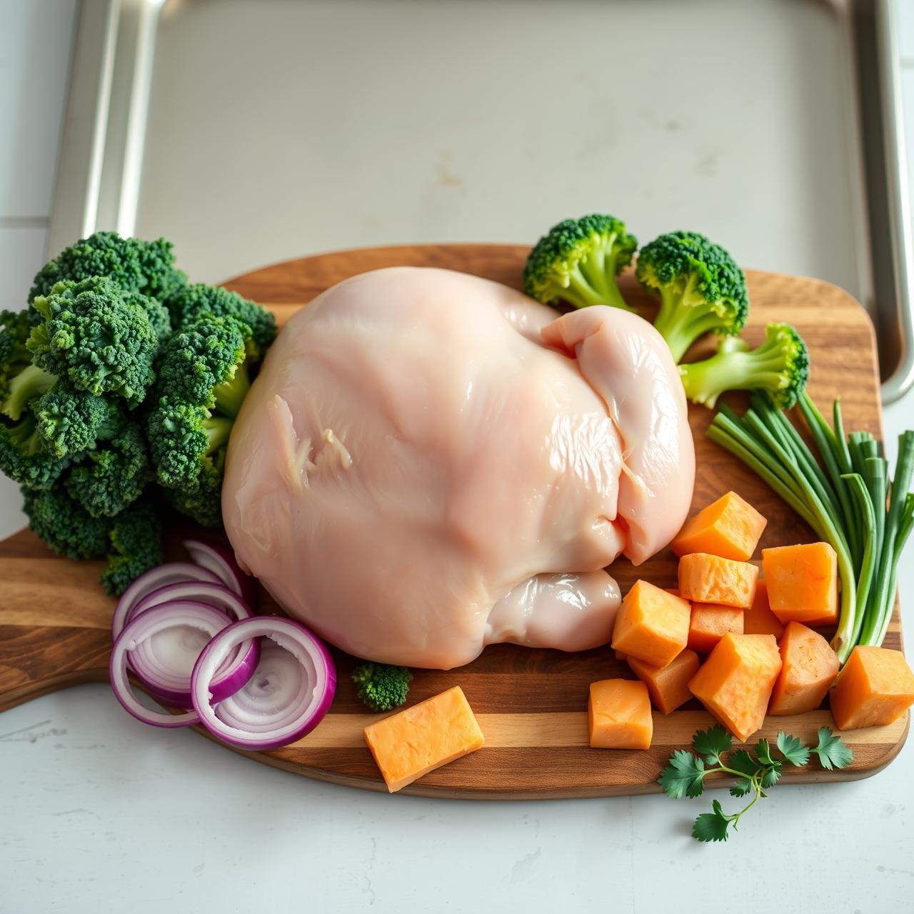 - Combine and Conquer: After 15 minutes, carefully remove the baking sheet from the oven. Push the partially cooked sweet potatoes and onions to one side and add the chicken and broccoli mixture to the other side of the pan. Spread everything out into a single layer again.