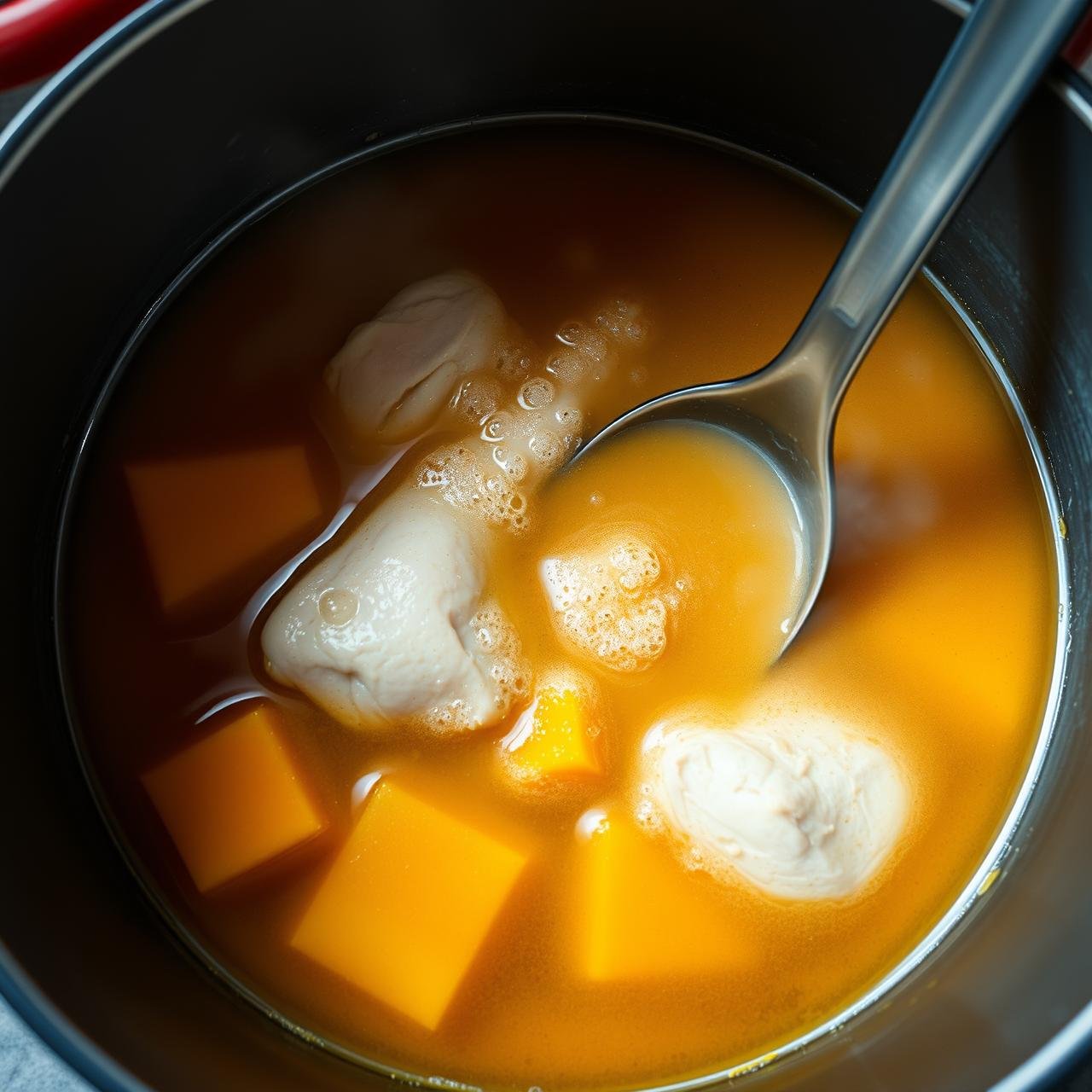 Pour in 8-10 cups of water or chicken stock—enough to cover the chicken by about 2 inches. Using a quality chicken stock will result in a richer soup, but water works perfectly fine as the chicken bones will create their own broth. Bring the liquid to a boil, then immediately reduce the heat to a gentle simmer.