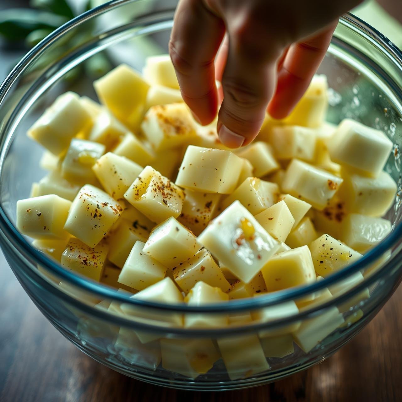 Place the kohlrabi cubes into your large mixing bowl. Drizzle with the olive oil, then sprinkle over the kosher salt, black pepper, garlic powder, and smoked paprika (if using). Use your hands or a large spoon to toss everything together until each cube is evenly coated in a thin layer of oil and spices. This ensures every single bite is flavorful.