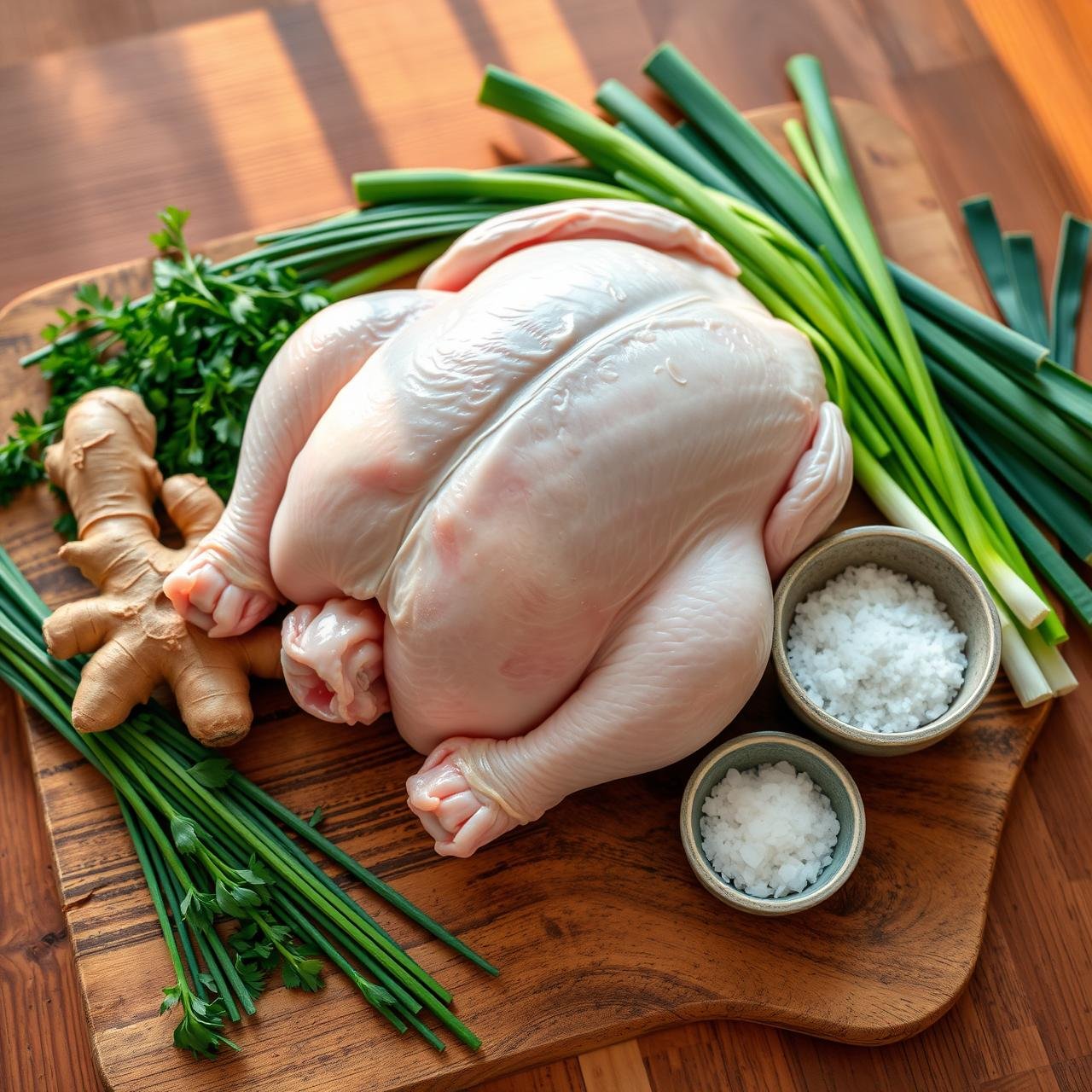 • Scallions (Green Onions): A bundle of 4-5 scallions. They will be used to stuff the cavity and lay underneath the chicken, releasing their sweet, delicate onion flavor during the cooking process.